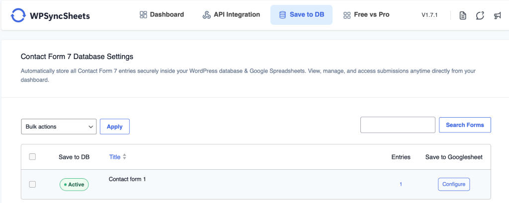 From your WordPress dashboard, navigate to: WPSyncSheets Lite > For Contact Form 7 > Save to DB.