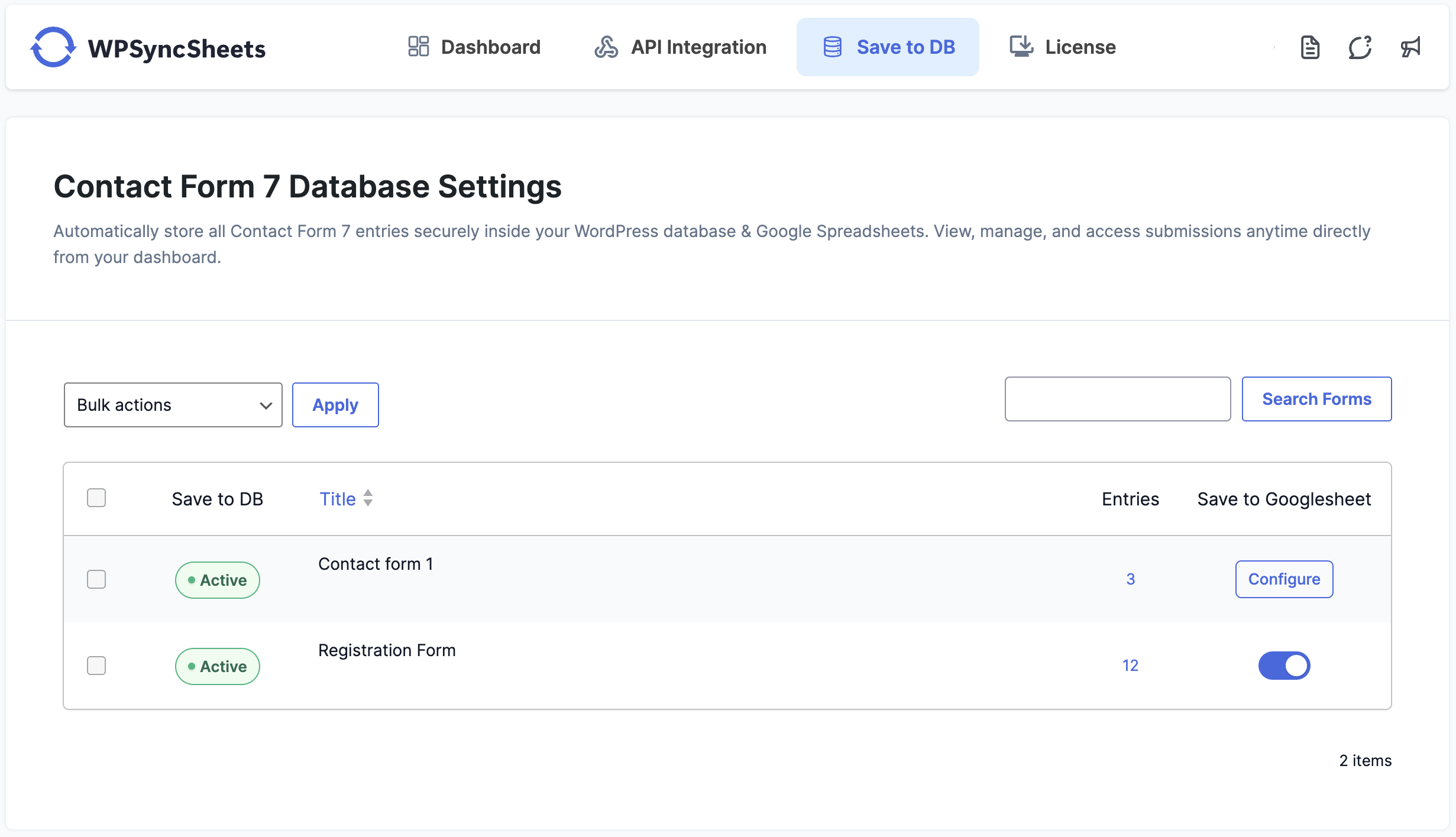 Save Contact Form 7 submissions directly in your WordPress database with a clean, powerful interface. Manage, search, export, and sync entries seamlessly — all in one solution.